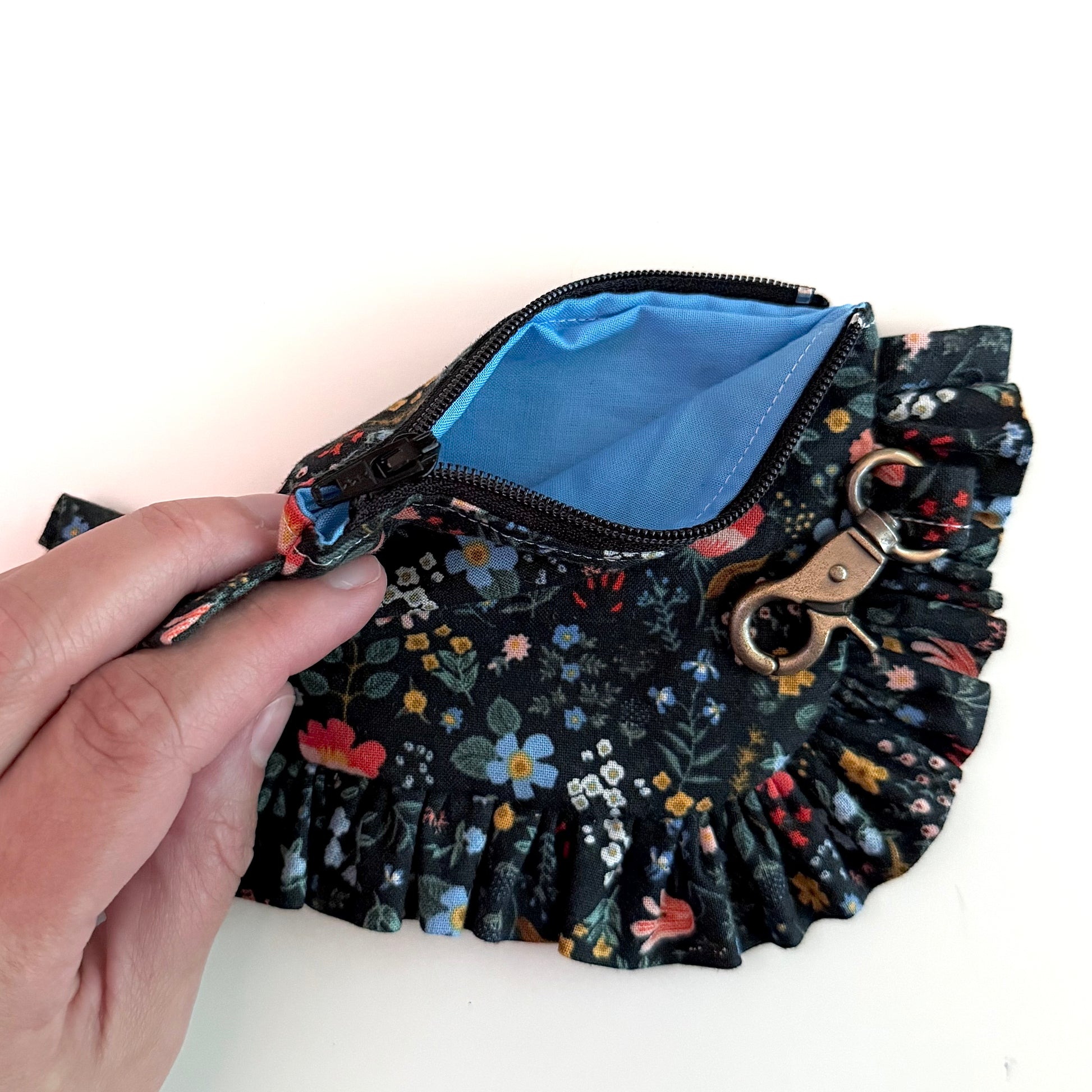 Handmade pouch with a playful ruffle trim. Clip it to your bag, keep it on your keys, or stash everyday essentials inside!