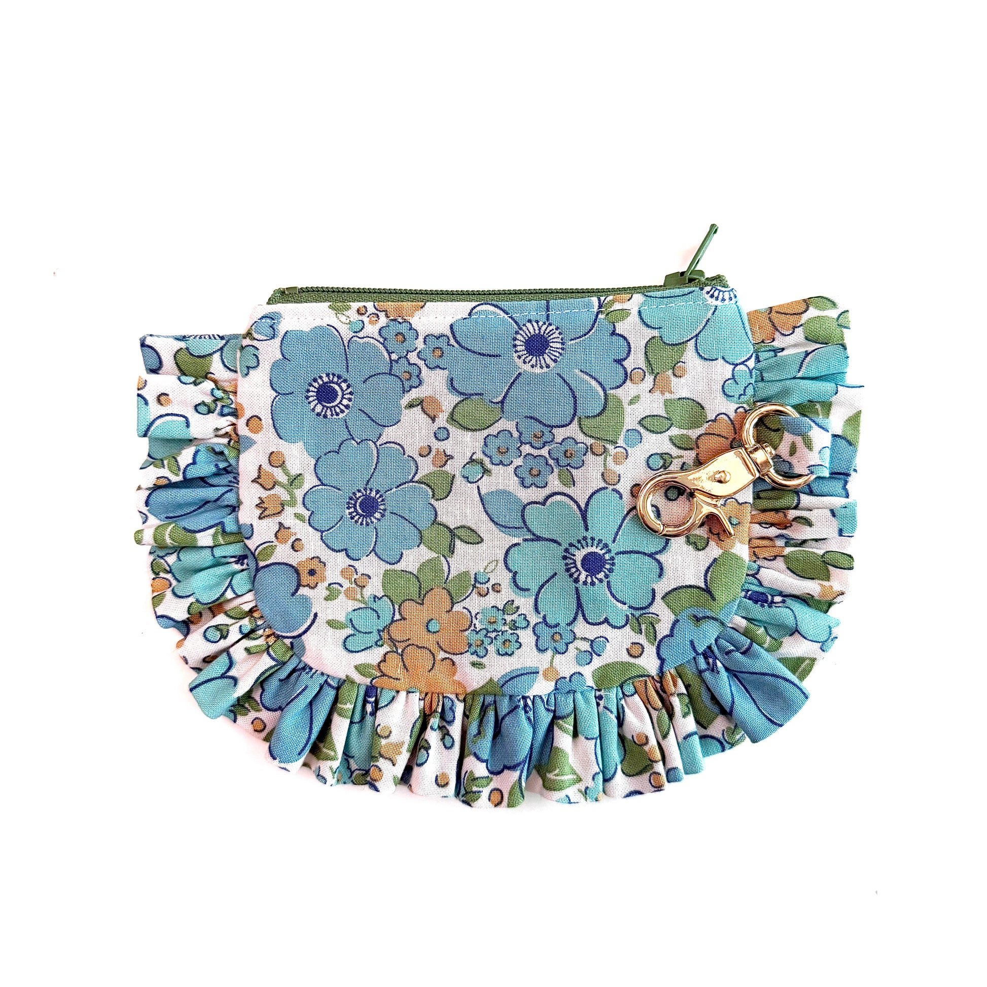 Handmade pouch with a playful ruffle trim. Clip it to your bag, keep it on your keys, or stash everyday essentials inside!