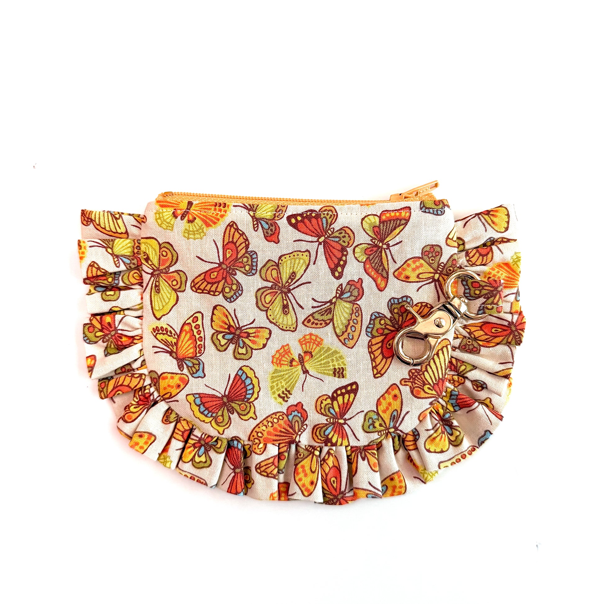 Handmade pouch with a playful ruffle trim. Clip it to your bag, keep it on your keys, or stash everyday essentials inside!